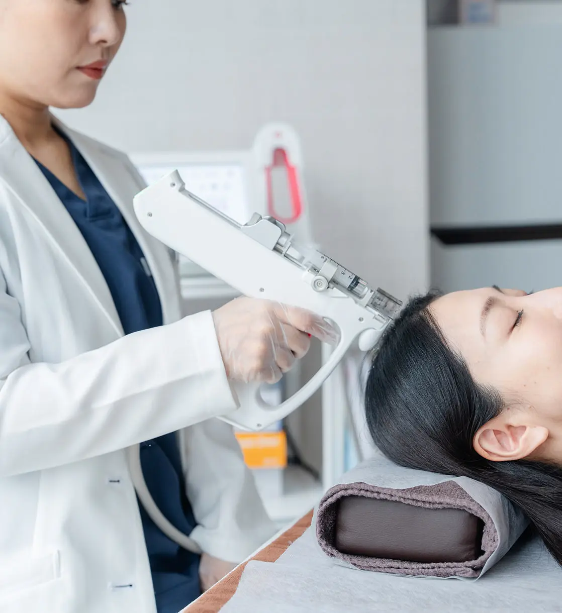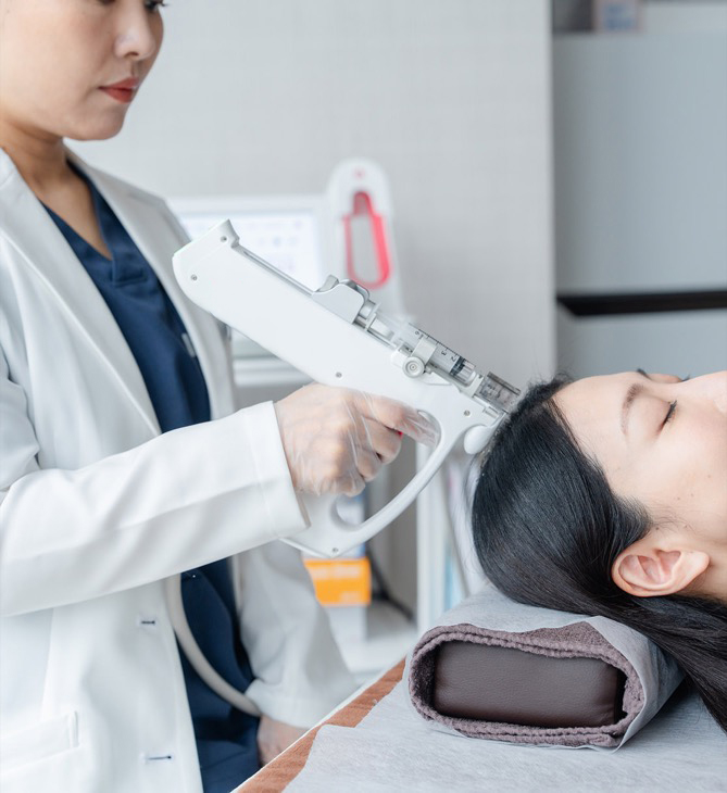 数百種類の成長因子やエクソソームを含む幹細胞培養上清液を用いた、当院オリジナルの毛髪再生メソセラピーです。独自の注入機器で毛根の細胞へ直接薬剤を届けることで、毛髪を生み出す機能を呼び覚まします。