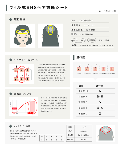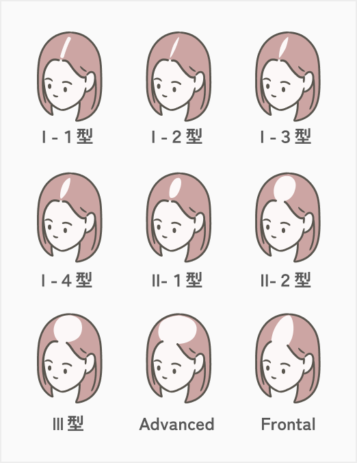 進行度の分類で有名なものとして、女性ではルードヴィッヒ分類、男性ではハミルトン・ノーウッド分類などがあります。一般的なクリニック診断では、この分類を基に14タイプに分け治療を行っておりますが、当院では独自の「ウィル式BHSヘア診断」を行い約10万以上の薄毛タイプに細分化し、一人ひとりの異なった症状に応じた最適な治療をいたします。
