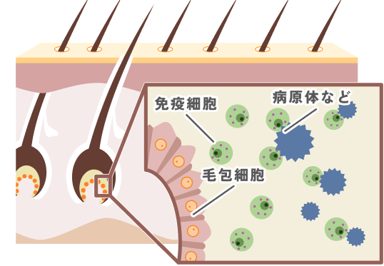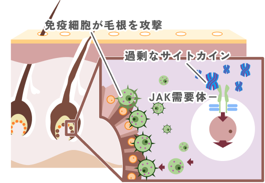 円形脱毛症の発症時、過剰なサイトカインが毛包に結合し、JAK需要体を介して核に伝達します。これにより免疫細胞が毛根を攻撃し脱毛が進行します。