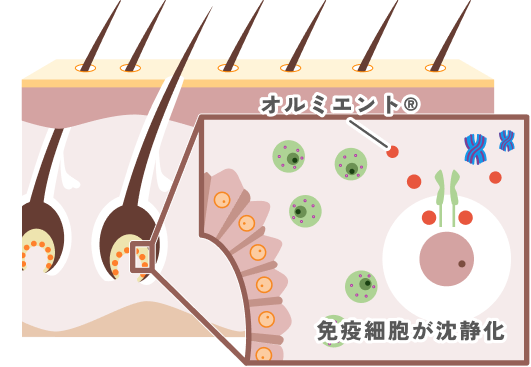 オルミエント治療薬®の服用でJAKシグナル経路を阻害、免疫細胞の毛根への攻撃を防ぎます。これにより炎症が軽減され毛髪の再生が促進されます。